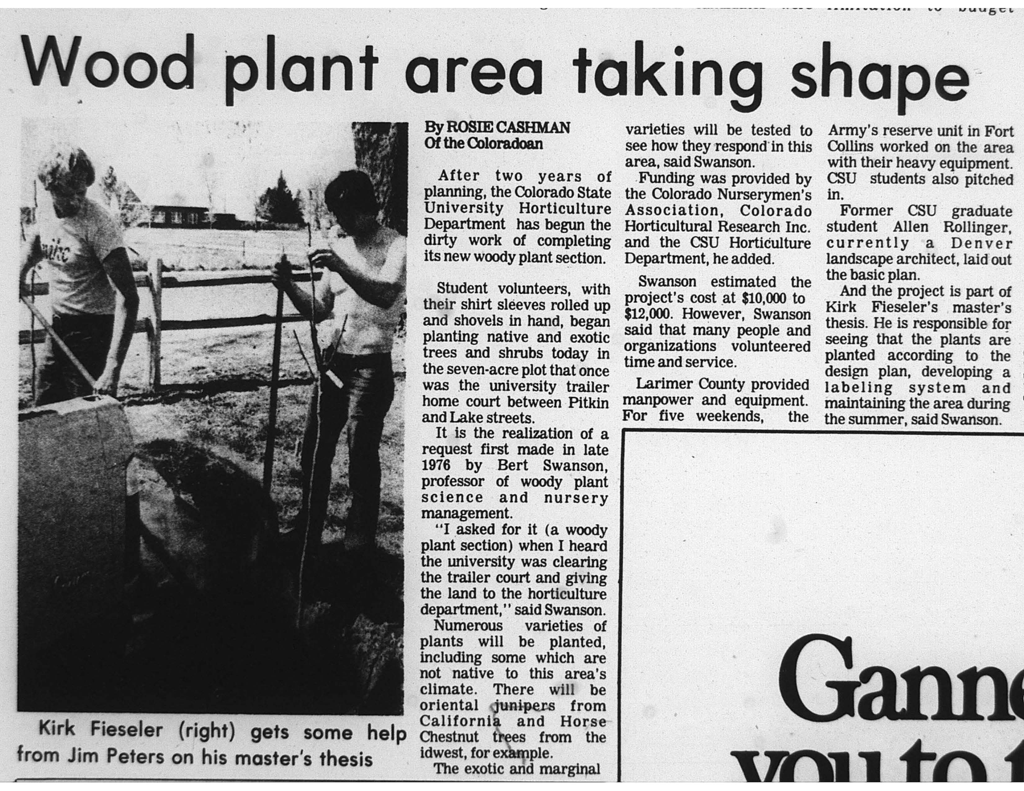 In 1973, the State Board of Agriculture, the University’s governing body at the time, agreed to close the CSU Trailer Court at 850 W Lake St. With the student population growing quickly after World War II, the trailer court had been created in 1953 for married veterans, but the amount of student housing had improved in subsequent years, reducing the need for temporary, affordable homes. Like others settling in the area, the trailer court residents had planted many fast-growing trees, especially Siberian elm (Ulmus pumila), to provide shade, and the trees had quickly grown to provide dense cover in just a few decades. In its decision, the Board offered the same two acres to the nearby W.D. Holley Plant and Environmental Research Center (PERC), a facility managed by the Department of Horticulture, and Dr. Bert Swanson petitioned for the development of a new woody plant collection on the grounds.